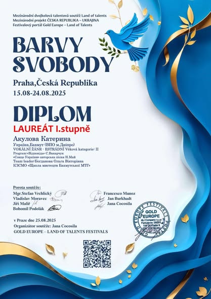 Наші талановиті учениці взяли участь у Міжнародному благодійному двотуровому конкурсі мистецтв “BARVY SVOBODY” (Чехія, м. Прага) та отримали високі відзнаки: